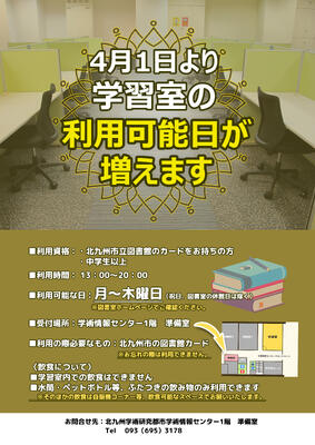 学術情報センター1階学習室の開室日が増えます! 投稿日時 : 03/19 図書館管理者 2026年4月1日より、学術情報センター1階学習室の利用日が下記のとおり変更いたします。どうぞ、ご利用ください! 利用可能日:(旧)火~木曜日 ➡ (新)月~木曜日 【学習室利用について】■利用資格:・北九州市立図書館のカードをお持ちの方 ・中学生以上 ■受付場所:学術情報センター1階 準備室 ■利用の際必要なもの:北九州市の図書館カード ※お忘れの際は利用できません。 ■お問合せ先:北九州学術研究都市学術情報センター1階 準備室 Tel 093(695)3178 Tweet {{options.likeCount}} {{options.likeCount}} 0 コメント